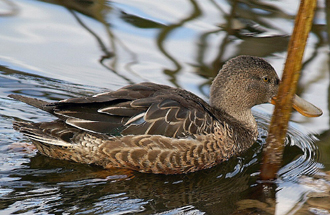 下右はオス(群馬県板倉町)ですが、上のオスと比べますと頭部の濃い緑色を含めて全体としてくすんだ色合いの翅をしています。これは、ハシビロガモに特徴的なサブエクリプスと呼ばれる状態です。下左は、メスによく似た状態、エクリプス(東京都上野不忍池)です。ほとんどの方がメスだと間違えます。この状態から、完全繁殖羽となる中間状態をサブエクリプスと呼ぶのです。眼と嘴の中間に白い縦線が見えるのがサブエクリプス期の特徴です。エクリプス、サブエクリプスそして繁殖羽のすべての期間を通してオスの光彩は黄色で、メスの褐色の光彩と区別ができます。