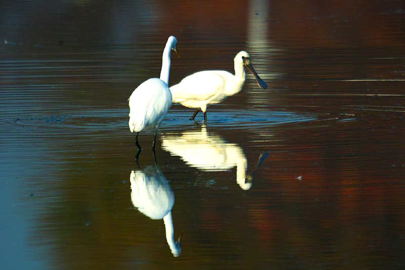下左の写真をご覧ください。眼で餌を探すチュウサギは、頸をまっすぐに立てます。それに対してクロツラヘラサギはまるで首をすくめるようにさえ見え、チュウサギの方がかなり大きく見えます。ところが実際の大きさは、チュウサギ65㎝に対して、クロツラヘラサギ77㎝なのです。下右の写真をご参照ください(双方、川越市伊佐沼)。