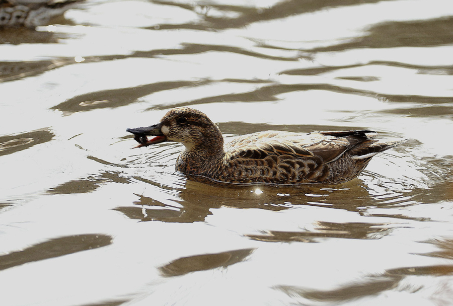 タイトル写真でお分かりの通り頭部の緑色とアイボリー色の紋様が巴状に見えることから命名されたことは間違いないでしょう。メスは全身褐色系で地味。下左の写真でお分かりのように、嘴基部の白い丸斑が特徴で、他のカモ類のメスとの見分けは容易です。川、沼、湖などの淡水系を専らのえさ場とし、海水系で観察できたことはありません。図鑑の解説によると、食性は植物性の餌が多い雑食性とあります。これまで観たところでは、いわゆるドングリなどのカシ類の実をこのんで食べていました(これはオシドリでも同様です)。