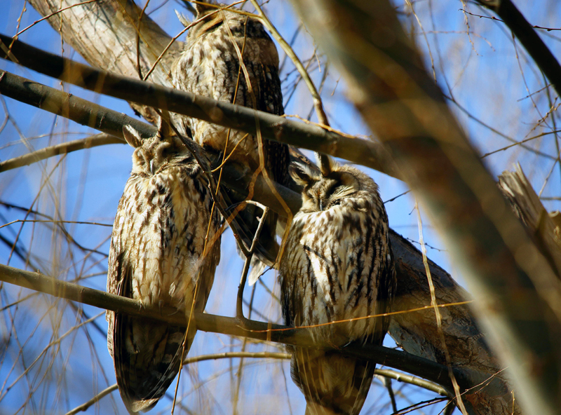 上のトラフズクは、東京都下の多摩川沿いの柳の木に合計6羽が越冬している状態です。越冬期間中、全てのトラフズクがこうした小集団で越冬するとは限らないようで、まだその生態には、分からない点が多くあります。