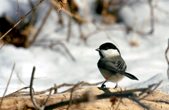 学名に付いている、montanusとは「山」の意味で、針葉樹林から広葉樹林に至る様々な森林にすむ、留鳥です。冬になると都市型の公園でも、山にいたヤマガラ、ヒガラ、ゴジュウカラなどは目にできることもあるのですが、このヒガラだけは見かけたことはありません。タイトル写真や上左の写真(軽井沢野鳥の森にて撮影)でもお分かりのように、雪が降ってもその場にとどまる個体もかなりいるのです。また、他のシジュウカラの仲間と異なるのは、木に自分で巣穴を掘って営巣することです(他のカラ類は、既存の穴を巣穴として利用します)。ただ比較的穴の掘りやすい枯れ木を選択するといわれています。後ほどご紹介します、コガラそっくりのハシブトガラは、自分で巣穴を作ることなく、他のカラ類と同様、開いている穴スペースを探して巣とするといわれています。
