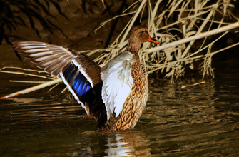 上の2枚はいずれも羽ばたいているマガモの雌雄です。この写真から、翼鏡の色は雌雄を問わず綺麗な紫味の強い青色であることがよく分かります(左はさいたま市サクラソウ公園、右は栃木県戦場ヶ原湯川)。