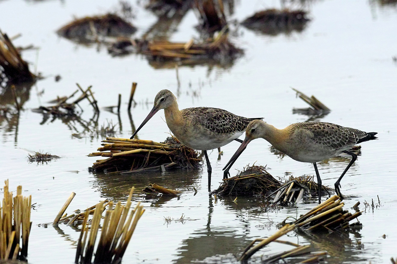 このシギの特徴の一つは、淡水域、汽水域、海水域をほぼ問わず国内では観察されることです。よく似たオオソリハシシギは汽水域や海水域に限って採餌する姿が観察されますが、オグロシギは水のはられた水田の様な淡水域にも降り立って採餌します。タイトル写真は蓮田、下右は水田、一番下は内陸の沼で撮影したものですが、下左は汽水域(谷津干潟)、一番下は海水域(東京湾野鳥公園)でのものです。