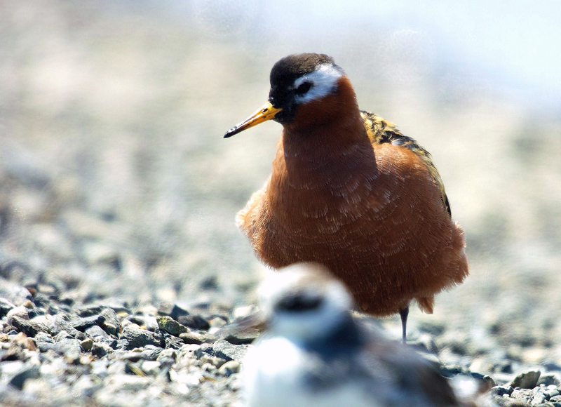 タイトル画像は夏羽に換羽したメス、下左は夏羽へ換羽しつつあるオスです。この2枚の画像では対比できないのですが、換羽を完了したハイイロヒレアシシギオスであっても、メスの方が色彩鮮やかで綺麗に見えます。タマシギが有名ですが、メスの方がきれいな野鳥は、抱卵をオスが受け持つようです。今のところその例外を知りません。また、タマシギ同様に一妻多夫である事が多く、時として一妻一夫で繁殖をすることもあるようです。