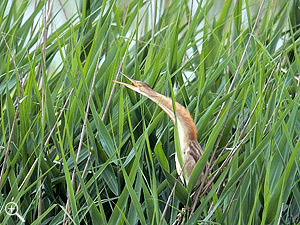 トップの写真でもお判りのように、虹彩は黄色く良く目立ちます。また、長い喉には白地に薄い褐色の縦斑が入ります。頭上に外敵がいると感じられた際には、この喉を誇示し、アシの茎と勘違いさせる効果を狙っているようです。また背中の濃い褐色の部分も、あたかも枯れ葉が重なっているように見える効果があるとも言われています。
