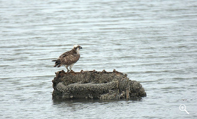 飛行中には判からないことが多いのですが、ミサゴには後頭部にあまり目立ちませんが冠羽があります。地上に降り立ったミサゴの頭部をご覧ください。威厳を帯びて見えませんか。ミサゴの名前の由来は、諸説あるようです。水サグルからとも、水捜(ミゾサガシ)からとも言われています。いずれにせよ水辺にいることがこの名前の語源に関係していることは間違いないようです。ミサゴのミは水(ミズ)から来ているといってもよいでしょうか。