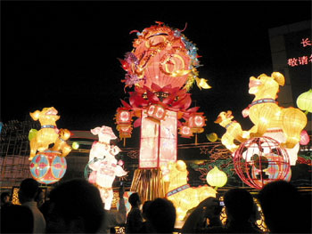 長安広場に集まった人たちと、ライトアップされた長安鎮の政府の建物、広場中央に設えられた飾り物。 普段は閑散とした広い広場も、人の波であふれていました。ひしめき合うと言うほどではないのですが、写真の通りかなりの数です。