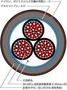導体に、99.99Cu(4Nクラス)高純度無酸素銅(OFC)採用。0.32mmφ×45本 3.5mu(スケア)3芯構造の外側を覆うアルミラップシールド、介在は天然綿糸。外側の被覆材は、環境に留意した新素材PVC( EU-ROHS規格準拠)のシースを特製ナイロン糸とポリエステル樹脂の2色編みの外装ジャケットで覆い、耐久性とインテリア性を追求しました。