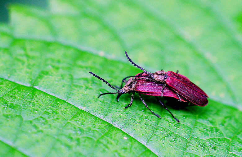先週もご紹介したベニボタルですが、たまたま交尾の場面を観察できましたので、再度の掲載です。ホタルとは近縁ではありますが、ベニボタル科には、発光する種はいません。
