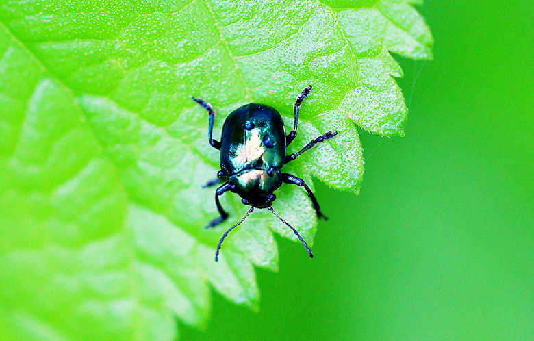 6oほどの大きさのハムシで、桑の葉にじっと止まっていました。金属光沢のある濃い青緑色がとても魅力的です。ただ残念ながら、このハムシの同定は決定的ではありません。よく似た色合いのハムシがまだ多種類いますので。