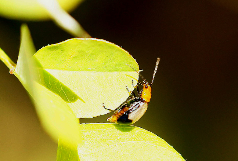 頭部、胸部が橙色、翅が銀色でとてもコントラストが綺麗なハムシ。翅(上翅)にこの個体は黒紋が二つあるが、三つあるもの、全くないものとがいる。夏には姿を消すハムシ。