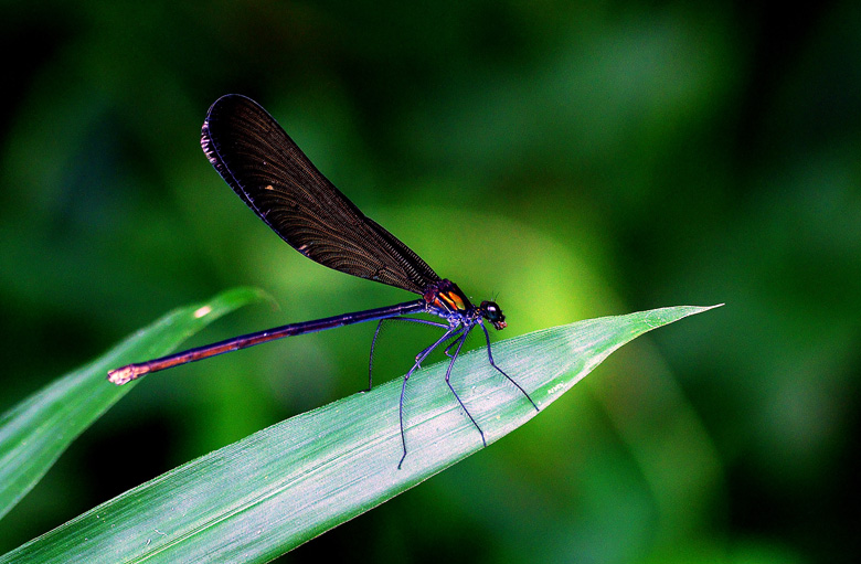 ハグロトンボのオスは、胸部から腹部にかけて、緑色の金属光沢があります。他方でこの個体の様なメスは、胸部に赤胴色の金属光沢があるだけで腹部は無光沢の黒です。ごくありふれたトンボですが、見かけるとホッとします。