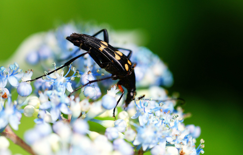 紫陽花に来たキモンハナカミキリです。この個体は大きめの黄色い斑が3対ありますが、白く小さめの4対の斑があるものもあり、生息地域によって個体差が大きいようです。ただその個体差が将来の研究で、種類差となるのかもしれません。