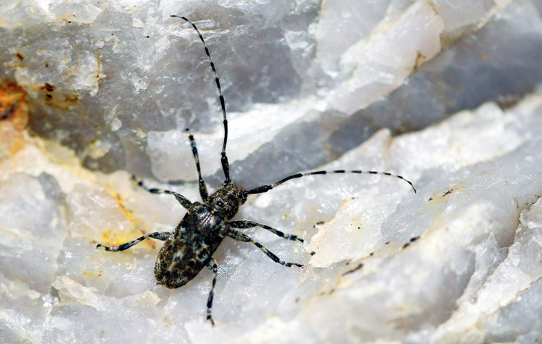 この個体も、我が家の灯火に寄ってきたもので、小型のカミキリムシの仲間、カタジロゴマフカミキリです。黒、茶色、白、灰色の不規則な模様が体上部に入り、よくとまる枯れ木や倒木を背景とするとまったく見分けがつかなくなります。