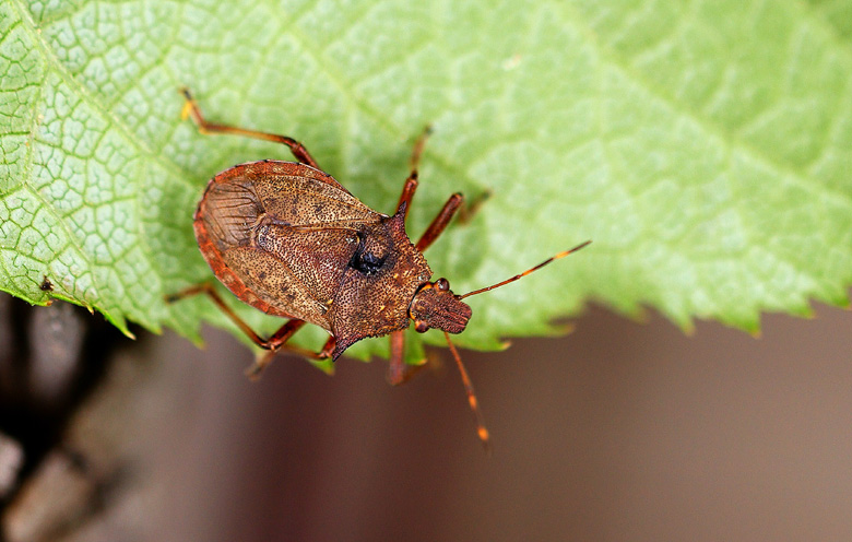 胸部背中の一部が何らかの原因で破損しているオオクチブトカメムシです。最初クチブトカメムシかと思いましたが、どうも腹部の形状および色が異なるよう思われ、カメムシの専門家の意見を聞きました。結果として、断定できないがオオクチブトカメムシだと思われるとのこと。腹部の外側のカーブがゆったりして見えます。同行した友人が見つけてくれました。感謝です。