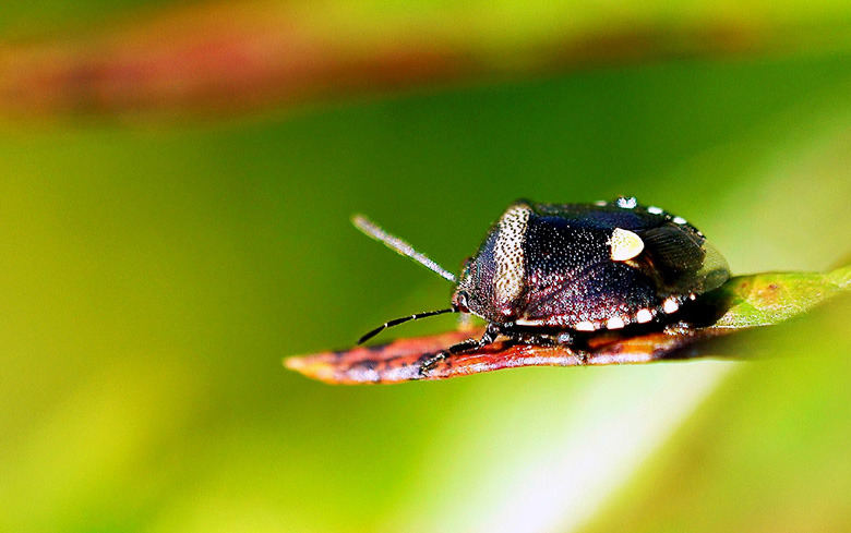 ネット上では、都市部でも普通に観察できると解説されているものもありますが、私は初めての観察、撮影です。直射日光があたり色が精確に出ませんが、暗い紫色で、背中の三角形(小楯板)の先端が白くよく目立ちます。10oほどで、動きは素早く、またよく飛翔していました。