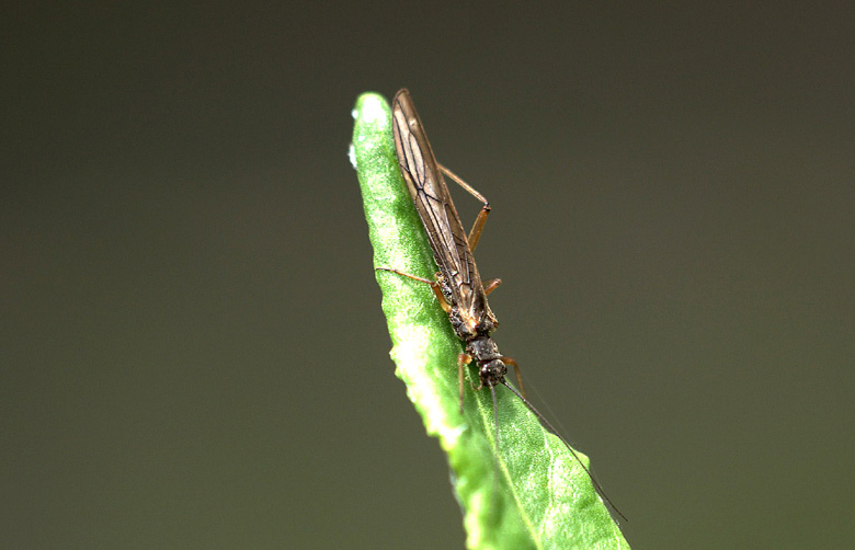 水辺のスイバの葉の上にとまっていたカワゲラの仲間です。幼虫期を水の中で過ごすのはトンボも同じですが、カワゲラの仲間の方が一足先に羽化して陸上に上がってきます。カワゲラの仲間を含め、水生昆虫の世界はまだ分かっていないことが多く、分類上も今後変化することが考えられます。