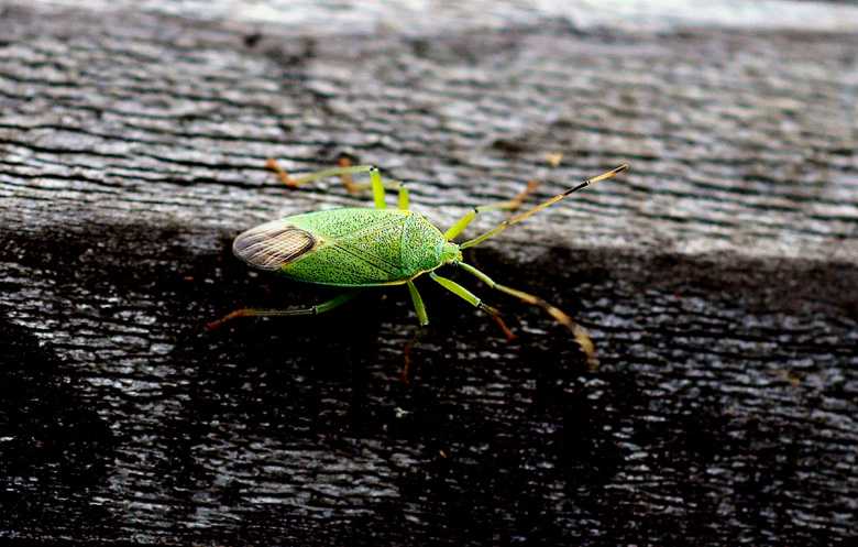 夏を迎えたこの時期、上面は綺麗な緑色で、肢は黄緑色をしています。秋になりますと、この背中の緑色は黄緑色にあせてきて、肢は赤くなります。その名の通りクヌギを食草としますが、それ以外にも、コナラやカシにも寄ってきます。貯水池の柵で休息中でしょうか。