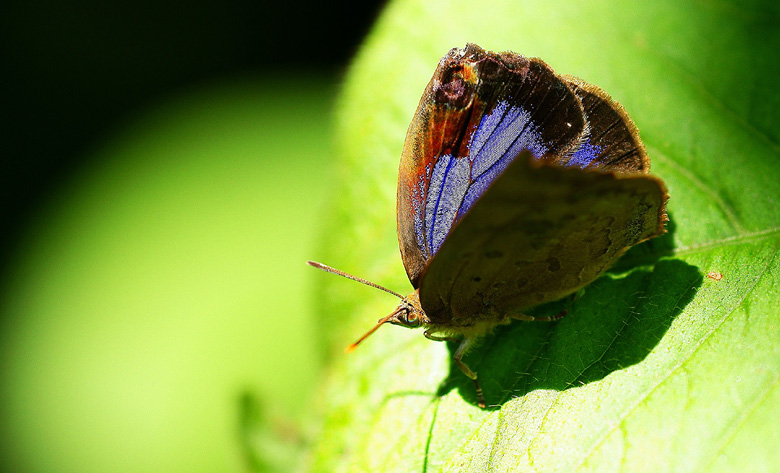 三波石峡の山道で、山側(反対側は神無川の渓谷)をひらひらと飛びまわっていた、ムラサキシジミです。翅の裏側は地味な褐色で、広げると表翅には青紫の鱗粉が輝きます。なかなかフルには開けてくれません。シイやカシなどの樹木を食草とするムラサキシジミです。