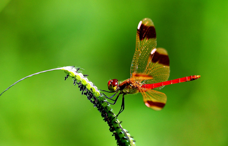 国内のアカネ(アカトンボ)の仲間では、翅の両端に濃い褐色帯があり最先端をあけているのはこのミヤマアカネだけだと思われます。ミヤマ=深山という意味でしょうが、意外と平野部でも観察できます。但し九州地区ではなかなか見ることができないようです。