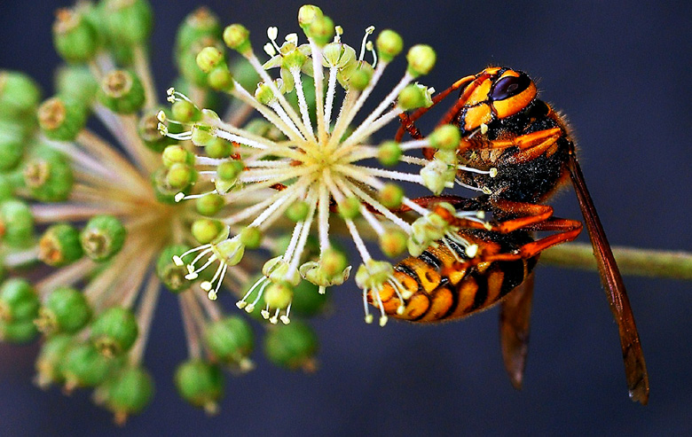 スズメバチの仲間の中では中型のキイロスズメバチ。でも20oほどはあります。花の蜜を吸うだけでなく、花に集まるハナアブの仲間も狩るといわれています。