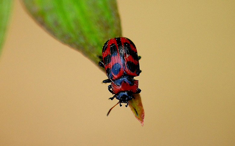 この個体は暗赤色ですが、黄色味の強い個体もいるようです。片方の翅に5個黒い斑があるのがこの名前の由来です。食草は、ケヤマハンノキ、ハンノキだといわれています。比較的珍しいハムシだといえます。