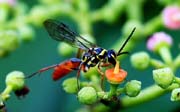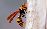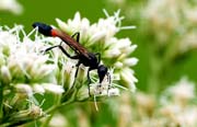 今回は、このシーズン見かけることのできたハチの仲間をご紹介します。 ハチと聞くと、「刺される」というイメージをお持ちの方がいらっしゃるかもしれません。事実スズメバチの仲間に子供が刺され一大事になるという事件は、ひと夏のうちには必ず全国のどこかで引き起こされる事故です。 まず、刺すのは全ての種類のハチではなく、スズメバチ科とミツバチ科の仲間に限られること、また刺すのはメスだけでオスは刺さないことは記憶にとめられるとよろしいでしょう。 |