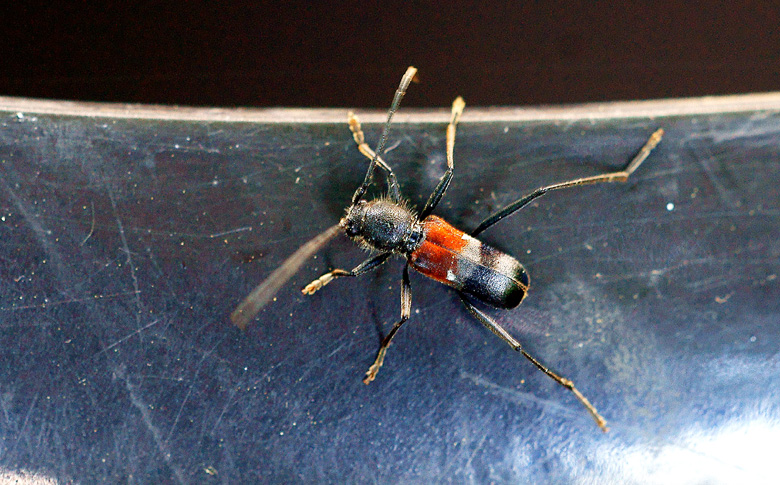 胸部の毛が目立つ比較的数少ないトラカミキリの仲間です。幼虫はクリ、ハルニレ、カラコギカエデなど寄主植物の1年枝内で育つといわれています。なかなか翅の模様が綺麗なカミキリムシです。