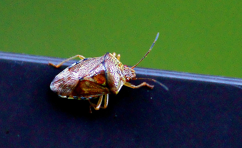 10o前後のツノカメムシの仲間の同定にはいつも悩まされます。背中(前胸背)の下縁が明確に黒いので、セグロベニモンツノカメムシと判断しました。