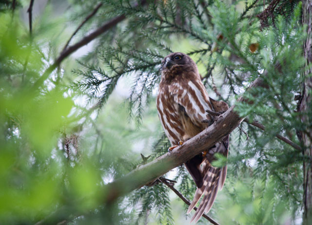 先週は、埼玉県内狭山市のアオバズクをご紹介しましたが、北本市でも例年通り見かけることができました。この個体もオスで、メスに比べて、下腹部の褐色の縦斑の色が濃く、太いといわれています。羽を若干伸ばす独特のポーズをとったところです。