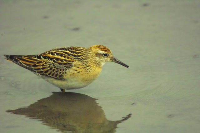 縦斑の数本入った明るい茶色のベレー帽を被ったように見えるウズラシギです。淡い黄褐色をした胸にはほとんど縦斑が見えませんので、幼鳥だと思われます。越冬地のインドネシアやニューギニアへと飛び立つものがほとんどですが、例外的に国内でも越冬個体が観察されています。このウズラシギはどうなのでしょうか。