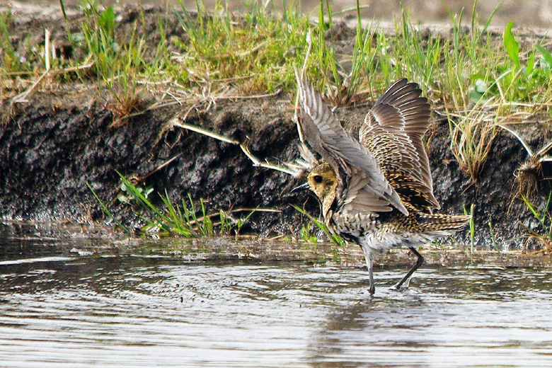 水浴びを終え、身体の水滴を落としているムナグロです。ムナグロの水浴びはダイナミックで、水の中で体を一周させるのです。