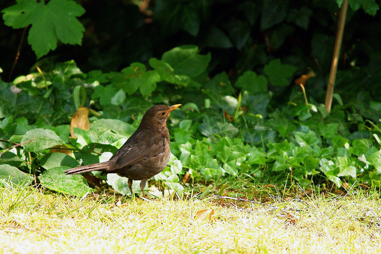 オスが黒いので、カラス科と間違えられそうですが、ツグミの仲間です。この時期は既に育雛に入っています。抱卵期にはあまり姿を現さないメスも、雛に与える餌を確保するためによく出て来ます。オスのアイリングは黒い顔の中で目立ちますが、メスのアイリングはちょっと褐色味を帯びていて褐色の顔の中で目立ちません。