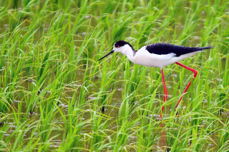 霞ヶ浦に隣接した、田圃の中で7羽のセイタカシギが餌を採っていました。青々とした稲とセイタカシギの赤い脚が、梅雨の曇天の下、清らかな絵を見ているようでした。