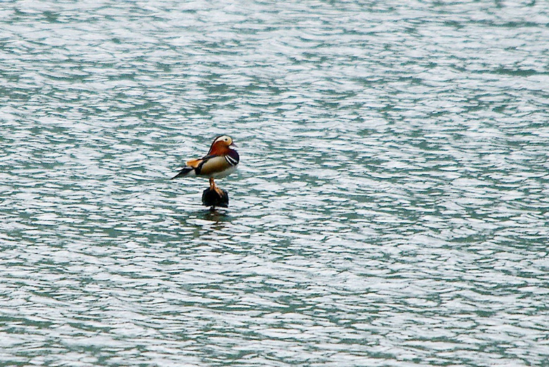 英名でMandarin Duckと呼ばれるように、中国東北部と日本列島に生息しています。玉原高原の玉原湖の岸からかなり離れた場所に一羽だけいたオシドリ・オスです。よく見渡すとかなたの対岸に数羽のオシドリがいました。全てオスでした。この湖を取り巻く森の中で繁殖しているようです。