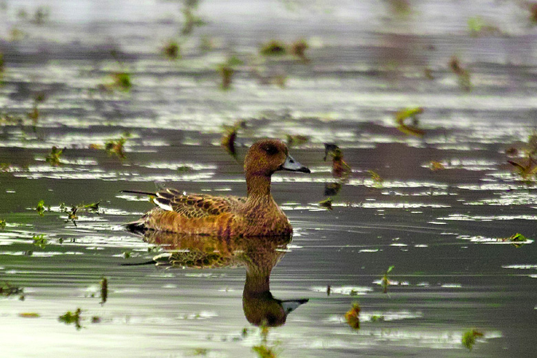 この日初めて近所の沼に1羽だけ飛来したヒドリガモ・メスです。本来は淡水系のカモですが、越冬時期には汽水域、海水域にも滞在します。世界的には、ユーラシア大陸とアフリカ大陸を往復する東半球のカモといえます。よく似たアメリカヒドリは、西半球のカモです(国内でもまれに観察されます)。 額から頭頂部にかけてクリーム色が鮮やかなオスに比べて、メスはまったく地味ですが、褐色系の顔の中で眼の周りにくまどりしたように黒っぽいのが特徴です。