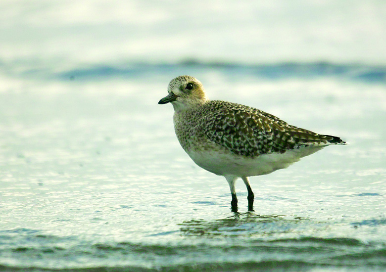 すっかり冬羽に換羽したダイゼンです。猛禽類の襲撃を警戒しているのでしょうか、ちょっと上を見えています。ここで越冬するダイゼンは、北極圏で繁殖しているものと思われます。 他方、晩春から初夏にかけて顔と胸、下腹部を真っ黒にした夏羽のダイゼンもここで見かけることができます。その時期ここでは、越冬した個体が換羽し北上するものと、東南アジアで越冬した個体が飛来したものとが混在しているのではないかと思われます。