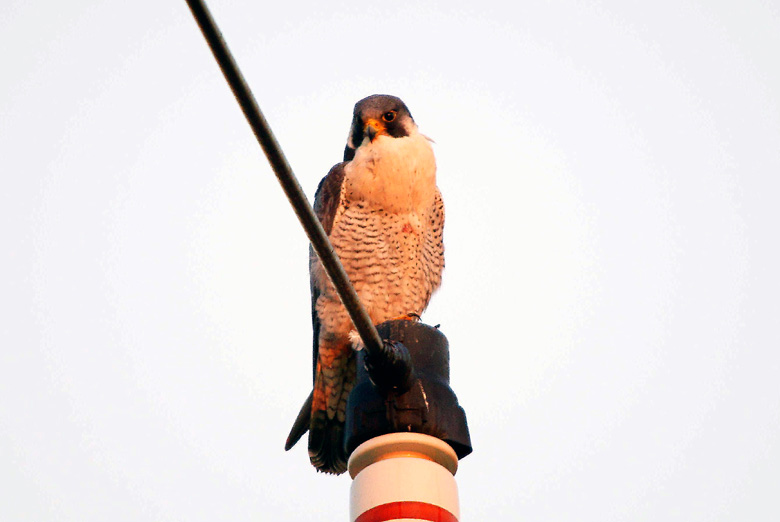 夕日に染まるハヤブサです。白い胸の下腹部上中央に傷を負っています。おそらく獲物を捕捉しようとした際に負った怪我ではないでしょうか。白い胸の部分を膨らませているのは、寒さのせいか、餌を採った際の興奮の残りかは分かりません。