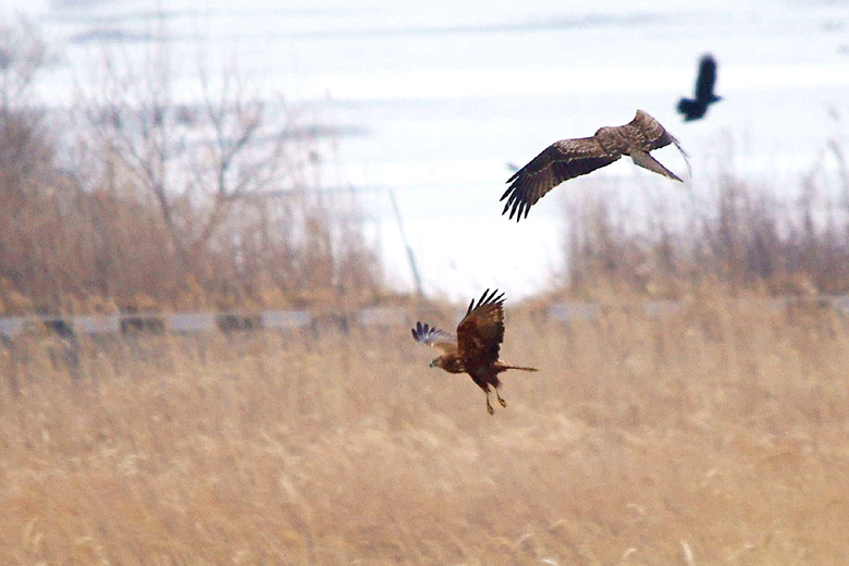 驚いたことに、トビがチュウヒを威嚇していました。トビの塒がこの近くにあり、仲間が沢山そばにいることから強気になっていたのでしょうか。チュウヒとトビの向こうに白くみえるのは谷中湖です。翼内側と胸、下腹部の茶色がよく目立つ綺麗なチュウヒでした。