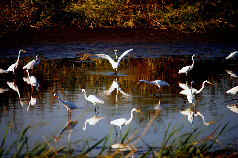 晩秋の多々良沼に集まった、チュウサギの群れです。初秋から初冬までここで過ごし、(チュウ)ダイサギのやって来る頃に南方へと飛び去っていきます。実に見事な切変わりなのです。