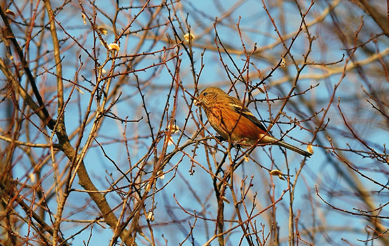 昨シーズンは、谷中湖の辺のアキニレにかなりの数のベニマシコが餌をついばんでいました。残念ながら今年は昨年に比べるとすっかり越冬数が少なくなっているようです。頭部から腹部にかけて茶色の目立つメスです。雌雄ともに翼に2本の白い帯が目立ちます。
