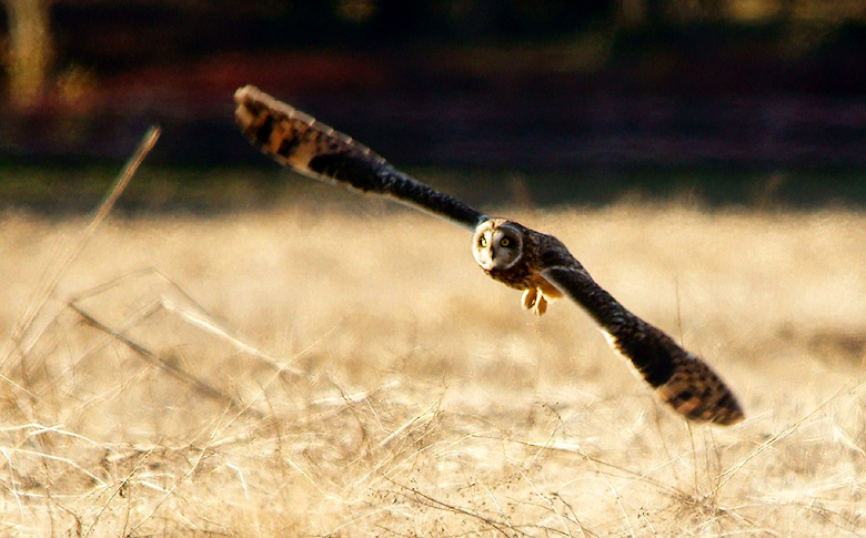 翼を全開にしたコミミズクです。翼を水平方向に伸ばしきった状態(翼全開)ですが、見たところ1メートルは優に超えていました。地上に降りてとまっているときに、ふっくらと見えますがそれはこの長い翼を折りたたんでいるためだと納得できます。