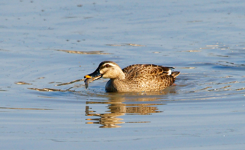 カモといいますと普通植物食性だと思われますが、この写真の様に、稀に動物も餌とするようです。かなり大きな魚を捕えたところです。