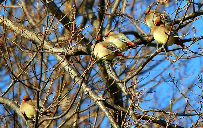 ヒレンジャクはまったく囀りをしない鳥の様です。短く地鳴きで、「ヒッーヒッー」と聞こえるように鳴きます。越冬時期には植物食性でヤドリギの実以外にも、ヤツデやニシキギの実を餌としますが、繁殖期には昆虫食を専らとするといわれています。国内から遠く離れた繁殖地でのこと、残念ながらヒレンジャクが昆虫を捕える場面は観察できておりません。