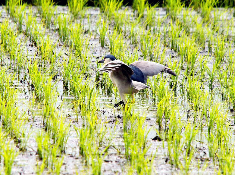 田植えの終わった田圃で、餌を探しているゴイサギです。サギの集団営巣地などではまだよく見かけることができるのですが、普通の田圃での個体数は近年極端に減って来ているように思われます。南北アメリカ大陸、ユーラシア大陸、アフリカ大陸と、豪州を除く全世界に生息しています。