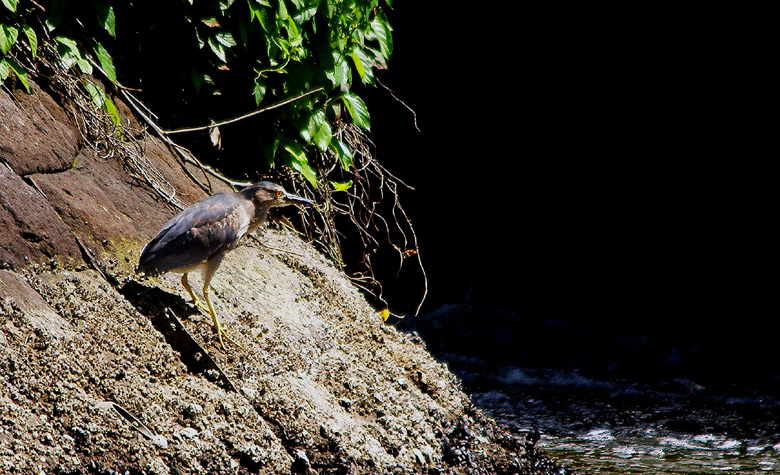 腹部、頸もとに青褐色味を強く残すゴイサギです。やっと成鳥になったばかりという段階でしょう。まだ縄張りを確保できていな様子で、この場所から後で他の成鳥から追い払われていました。