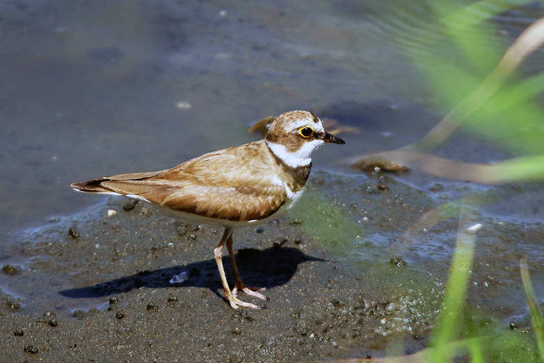 野鳥公園の汽水域には、いつも複数羽のコチドリがいます。第1観察小屋の方にやってきた、若いコチドリです。アイラインの黄色は目立つものの、頸周りの斑に黒い部分はなく、眼の周辺にも黒い部分が全くありません。完全な成鳥の羽となるのは来年の繁殖期でしょう。