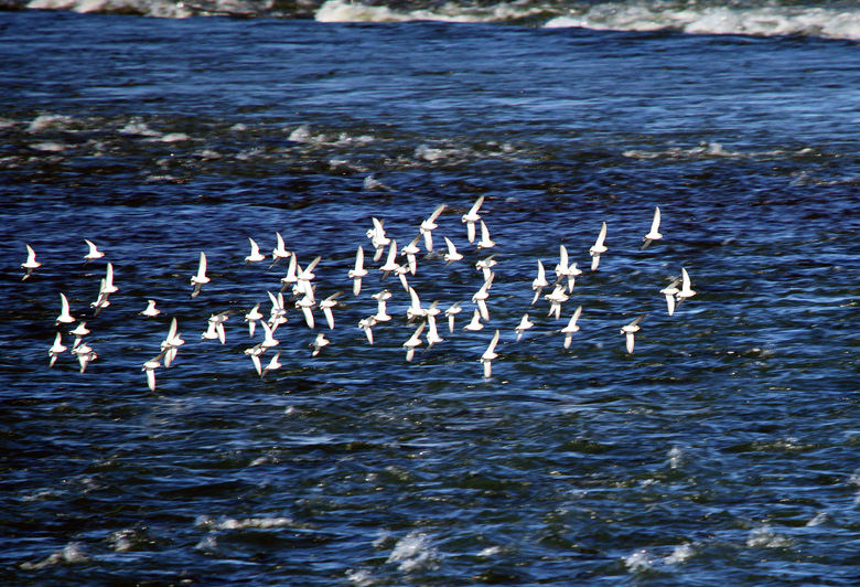 昨年も、ここ利根大堰(武蔵大橋)の下流側で数十羽のハマシギの群れを見かけました。丁度サケが遡上を始めるこの時期に合わせたかのように、ハマシギがやってきます。北極圏で繁殖活動を終えたハマシギが、越冬するために南下しています。ここでは、長くは留まりませんので、この小さな群れはより南まで更に飛翔を続けることでしょう。