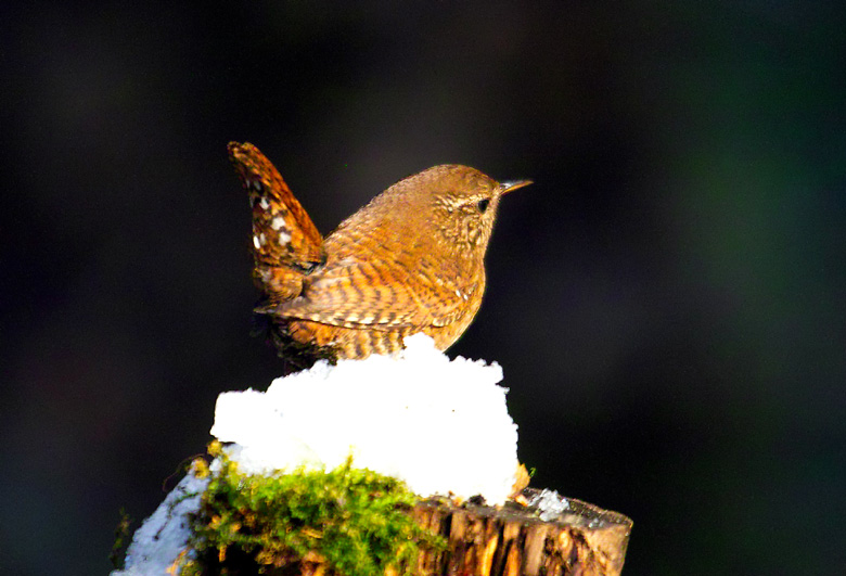 ミソサザイは、繁殖は亜高山帯の渓流域が多いといわれています。雪におおわれる山から平地に下りて越冬する個体と、そのまま山間部に残る個体に分かれるようです。越冬に平地に下りる個体が毎年同じ行動をとるかどうかは、まだ分かっていません。 止まるとよく尾を立てます。尾裏側の白い斑がよく見えます。たまたま降った雪の上で、全体が明るい茶色に撮れました。