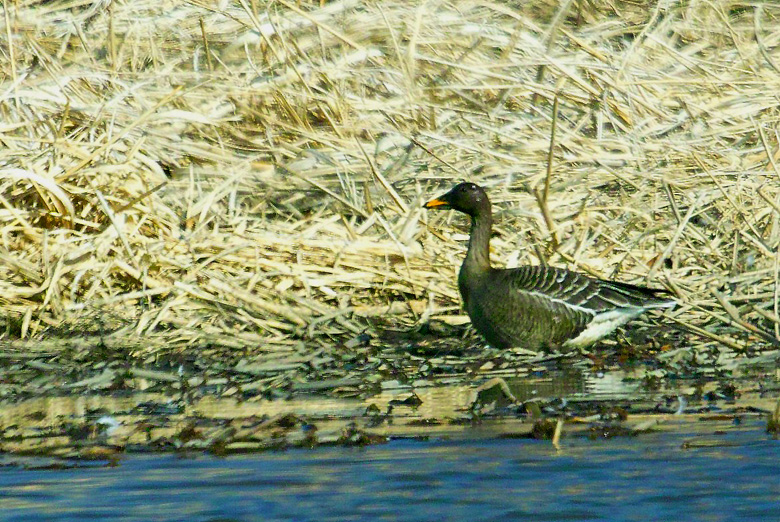 先週は、ガバ沼近くの多々良沼に来たマガンをご紹介しました。今回は、ガバ沼のヒシクイです。地元の方によると、このヒシクイはオオヒシクイ5羽と一緒にやってきたそうで、オオヒシクイが去った後も残っている個体です。国内で越冬するのは8割が亜種オオヒシクイだといわれていますので、亜種ヒシクイは珍しいカモの仲間といえます。絶滅危惧第U種に指定されています。 |